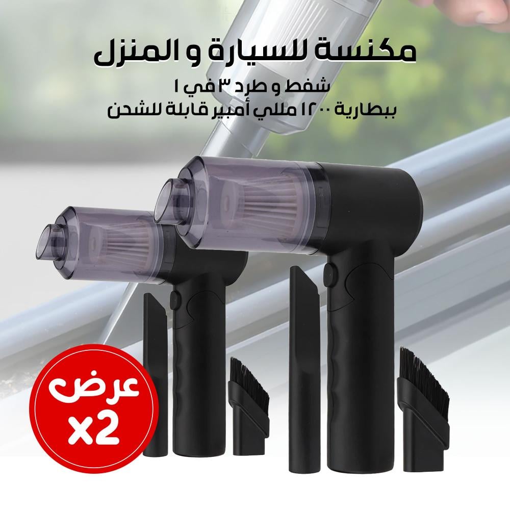 مكنسة لاسلكية للسيارة و المنزل ، نظافة متنقلة وفعالة بين يديك مع عرض مكنستين للسيارة والمنزل باللون الأسود. تجمع بين الشفط والطرد في تصميم 3 في 1، وتعمل ببطارية 1200 مللي أمبير قابلة للشحن لتمنحك تجربة تنظيف سريعة أينما كنتِ.
