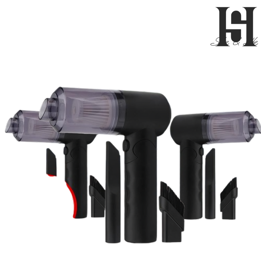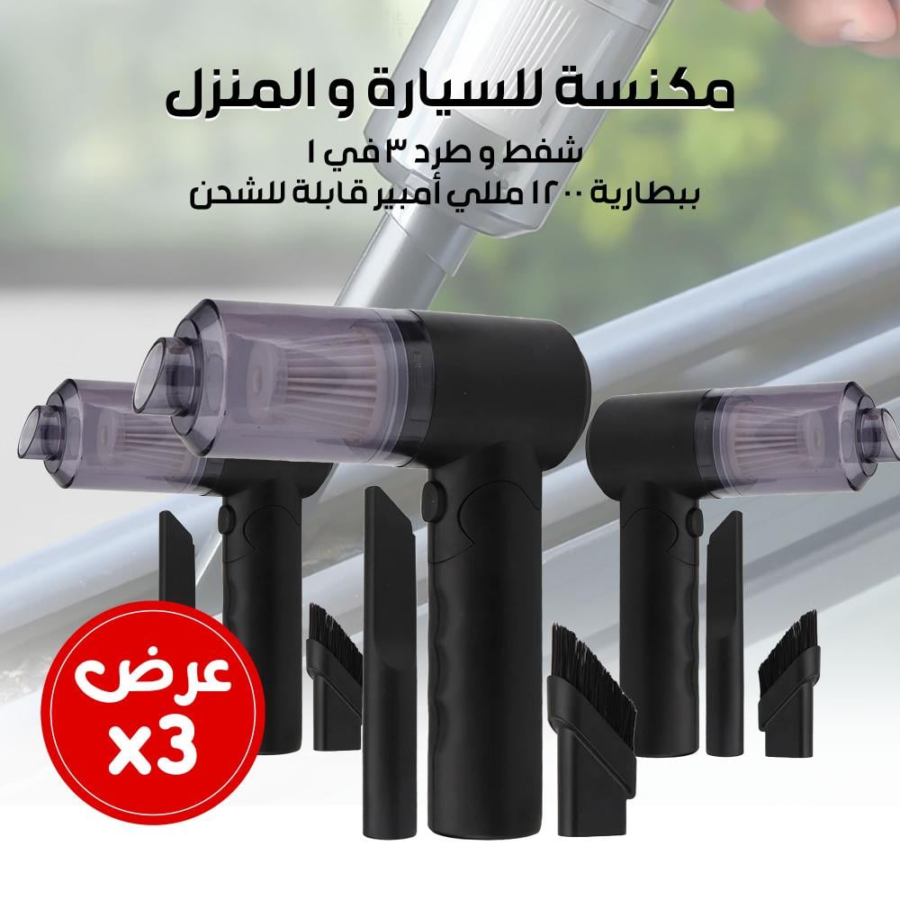 استمتع بالنظافة في كل مكان مع عرض 3 مكنسة للسيارة والمنزل. تصميم مدمج باللون الأسود، يعمل بنظام 3 في 1: شفط، طرد، وتنظيف شامل، مع بطارية قابلة للشحن بسعة 1200 مللي أمبير.